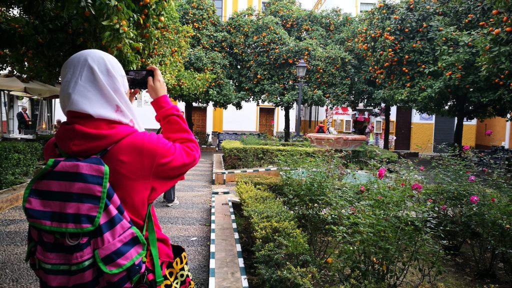 Patio de Banderas: During the Muslim era of the city, while they lived in the fortress (the origin of the Royal Alcazar), Abderramán III ordered this space to be built as a palace (10th century). It came to be known as the Dar Al-Imara or Prince’s house, or the house of the Governor, which was accessed by another door, currently blocked off. Later it was a parade ground. Currently, full of orange trees, it is the exit from the Royal Alcazar. From here you can take good photos of the Giralda, but only of its upper half.